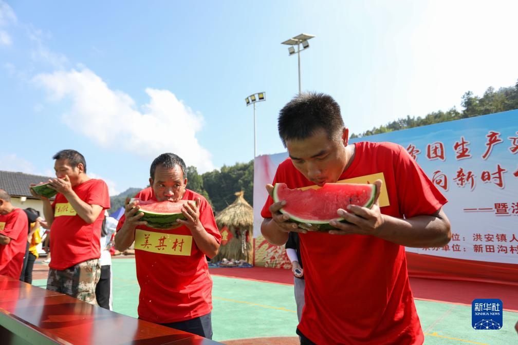 9月15日,在秀山縣洪安鎮農民趣味運動(dòng)會(huì )現場(chǎng),村民參加吃西瓜比賽。