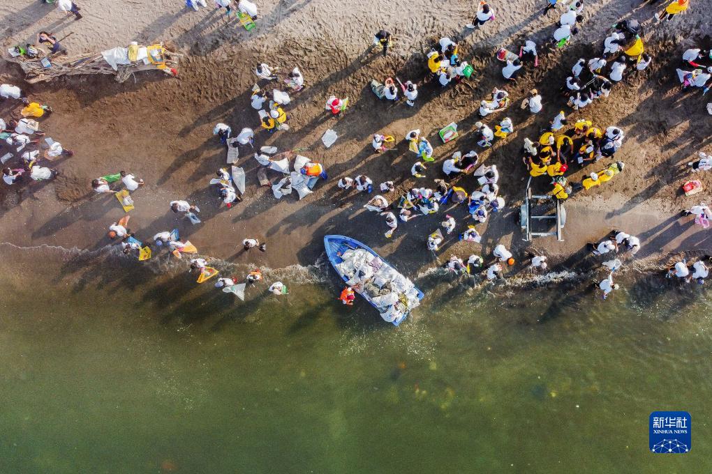 9月16日,志愿者在菲律賓馬尼拉灣舉辦的“國際海岸清理日”活動(dòng)上清理垃圾(航拍照片)。