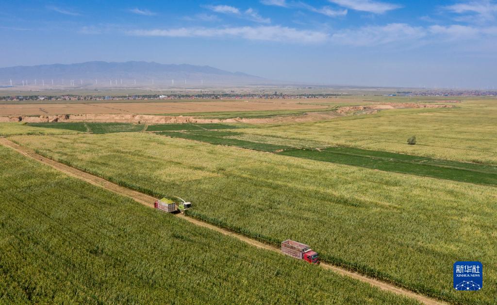 收割機在寧夏吳忠市同心縣韋州鎮現代高效節水灌溉項目建成后的高標準農田收割玉米(無(wú)人機照片,9月14日攝)。
