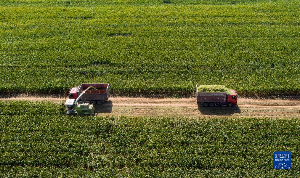 收割機在寧夏吳忠市同心縣韋州鎮現代高效節水灌溉項目建成后的高標準農田收割玉米(無(wú)人機照片,9月14日攝)。