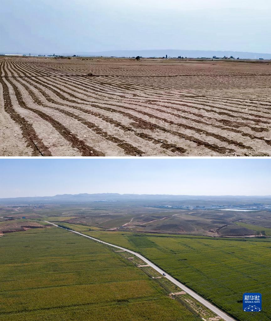 這是一張拼版照片,上圖是寧夏吳忠市同心縣韋州鎮高標準農田的滴灌帶(資料圖片,2023年6月9日攝);下圖是9月14日拍攝的位于寧夏吳忠市同心縣韋州鎮現代高效節水灌溉項目建成后的高標準農田(無(wú)人機照片,新華社記者楊植森攝)。