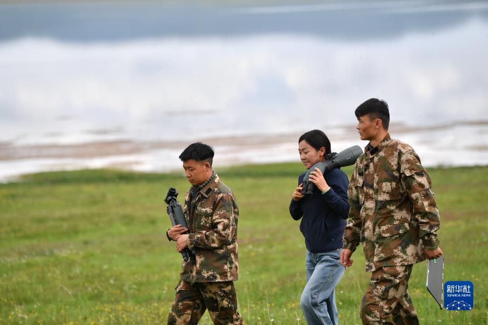 甘肅尕海則岔國家級自然保護區管護中心尕海保護站站長(cháng)香毛吉(左二)和同事在保護區內巡護(7月7日攝)。