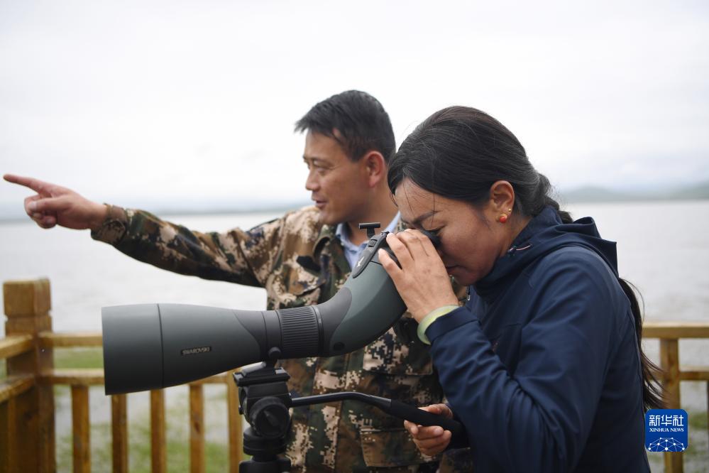 甘肅尕海則岔國家級自然保護區管護中心尕海保護站站長(cháng)香毛吉(右)和同事在保護區內用望遠鏡觀(guān)測野生動(dòng)物(7月7日攝)。