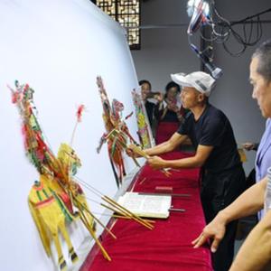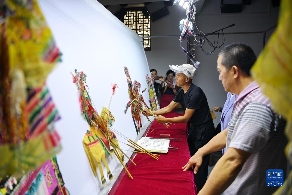 9月16日,皮影戲藝人在玉田縣“非遺會(huì )客廳”皮影工坊內表演皮影戲。
