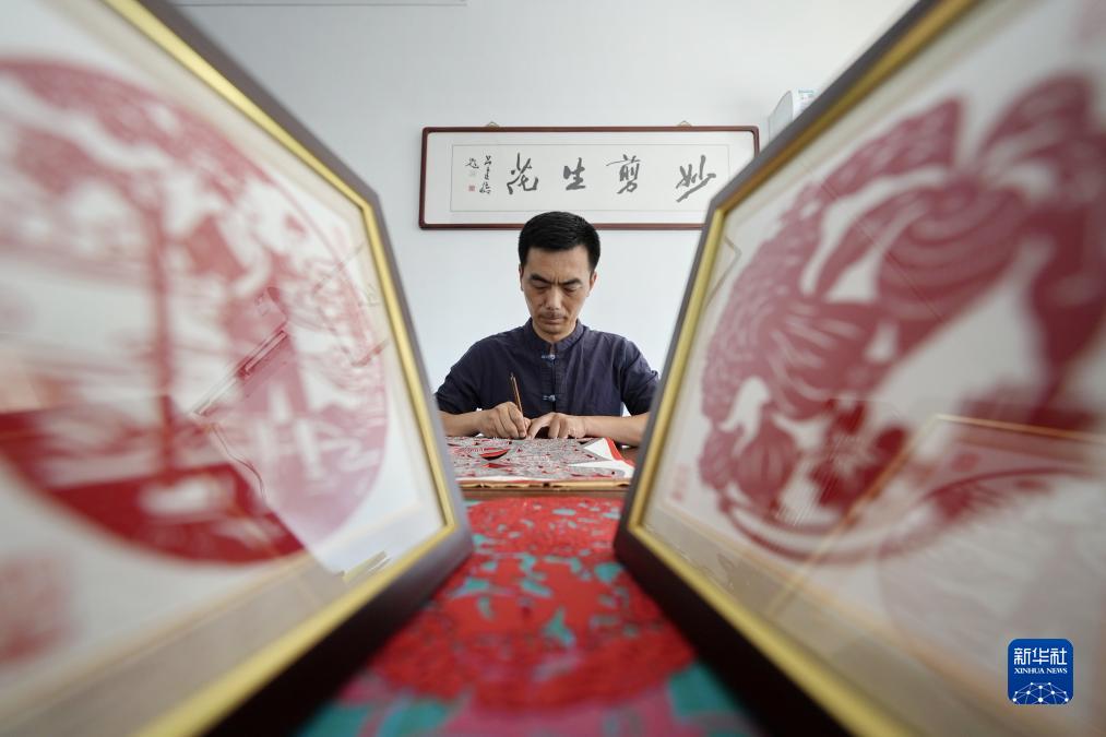 9月16日,剪紙藝人在玉田縣“非遺會(huì )客廳”工作室內創(chuàng )作剪紙作品。