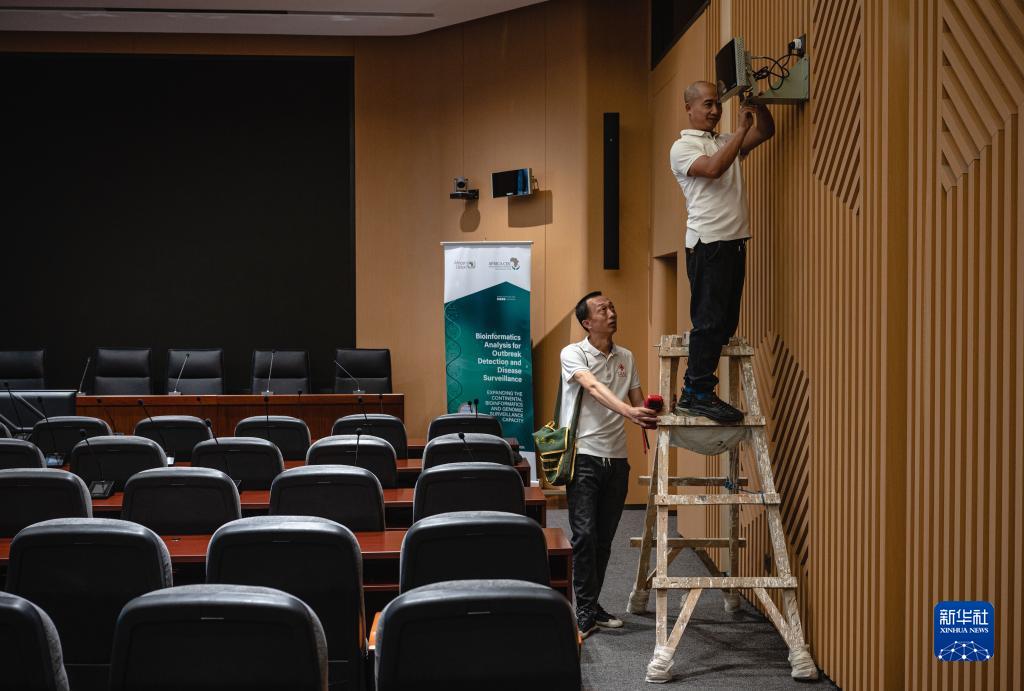 9月11日,中方技術(shù)服務(wù)組成員在埃塞俄比亞首都亞的斯亞貝巴非洲疾控中心總部大樓內檢查會(huì )議同聲傳譯系統。