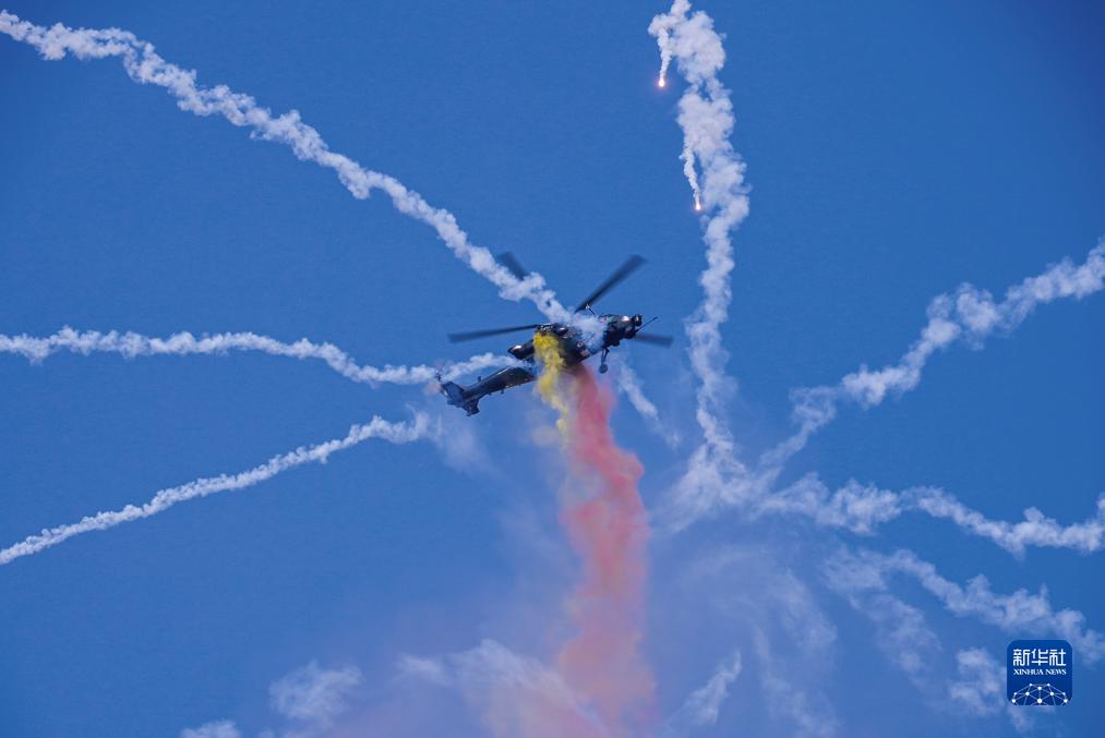 9月16日,陸軍“風(fēng)雷”飛行表演隊直-10武裝直升機發(fā)射干擾彈。