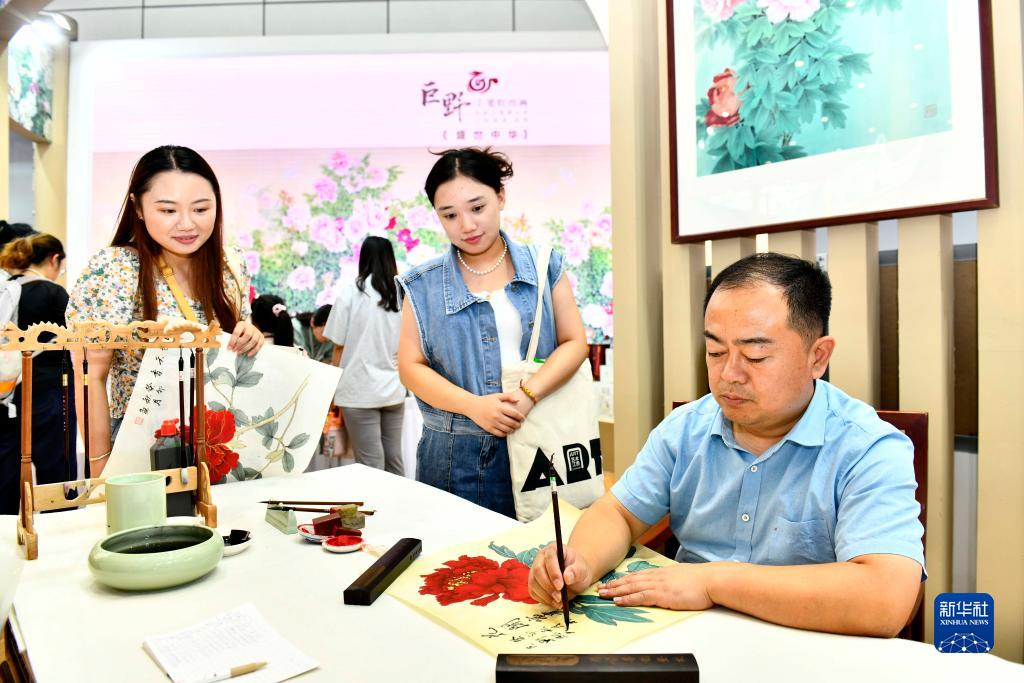 9月16日,在山東國際會(huì )展中心,來(lái)自巨野書(shū)畫(huà)院的藝術(shù)工作者侯福常(右一)在展示工筆牡丹畫(huà)技藝。