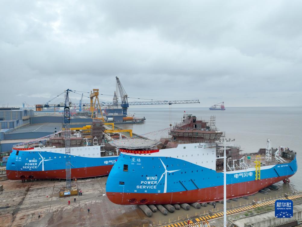 9月16日在江蘇啟東海工船舶工業(yè)園拍攝的兩艘風(fēng)電運維母船(無(wú)人機照片)。