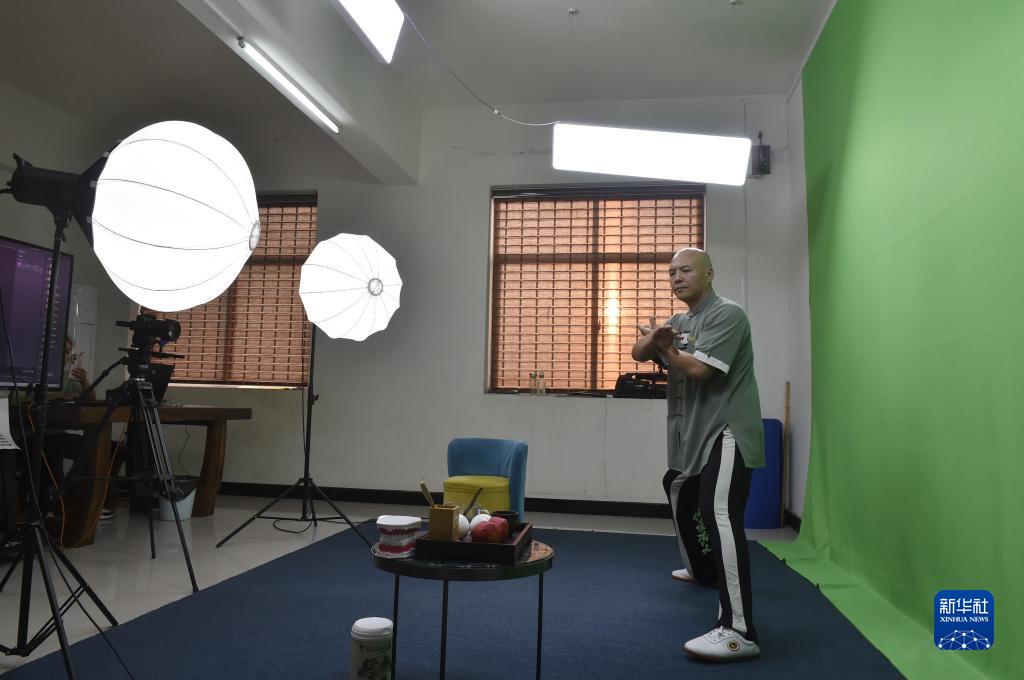 9月15日,太極拳傳人王戰軍在河南溫縣陳家溝自己的武校直播間內,通過(guò)網(wǎng)絡(luò )直播推廣太極拳。