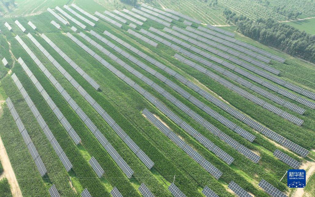 這是在遼寧省彰武縣馮家鎮哈大冷村拍攝的太陽(yáng)能光伏發(fā)電設備(7月11日攝,無(wú)人機照片)。