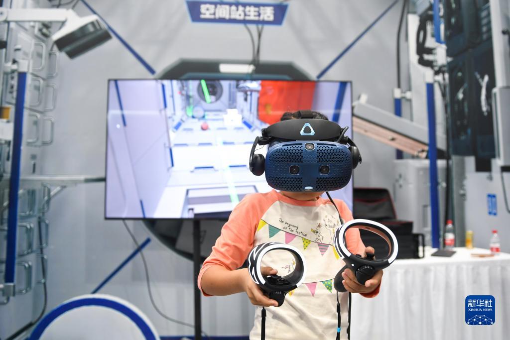 9月17日,在全國科普日北京主場(chǎng)活動(dòng)展區,小朋友使用虛擬現實(shí)設備感受天和核心艙內的生活。