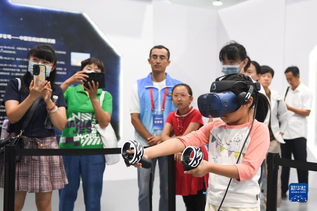 9月17日,在全國科普日北京主場(chǎng)活動(dòng)展區,小朋友使用虛擬現實(shí)設備感受天和核心艙內的生活。