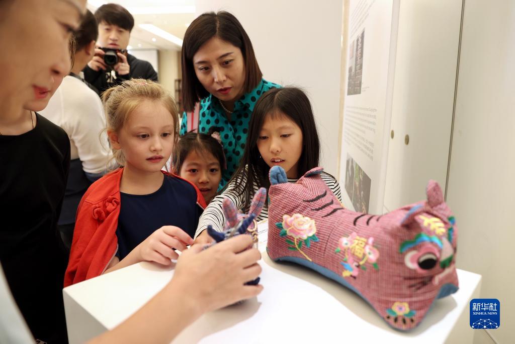 9月16日,小朋友在比利時(shí)布魯塞爾的中國使館開(kāi)放日活動(dòng)上參觀(guān)土布玩偶。