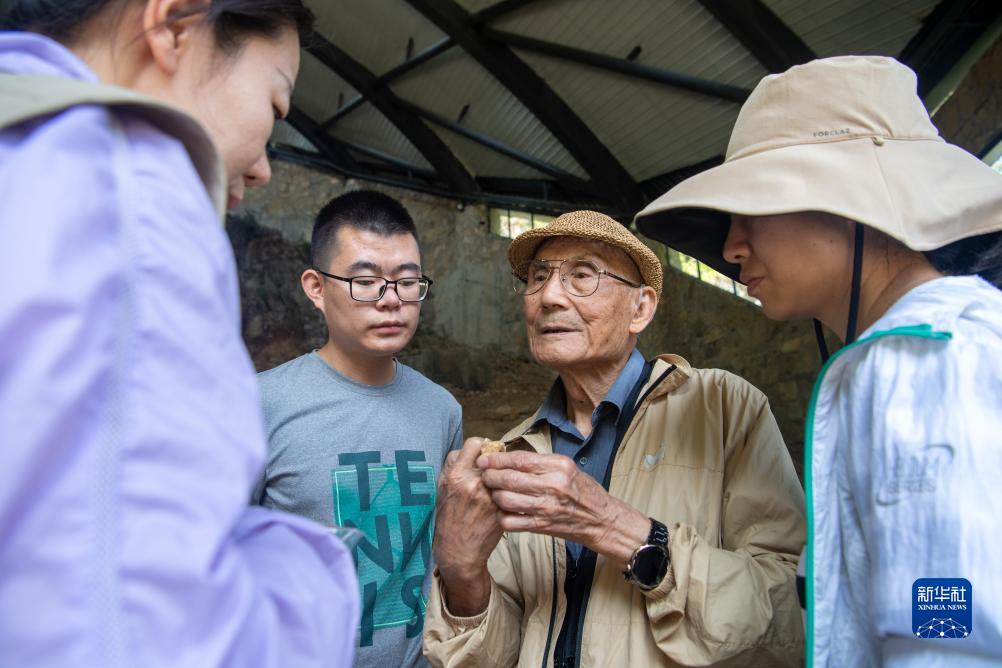 9月14日,黃萬(wàn)波(右二)與考古發(fā)掘隊隊員在仔細觀(guān)察剛出土的化石。