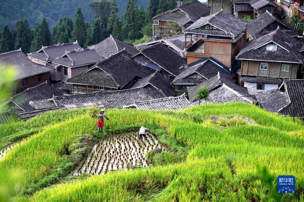 9月17日,村民在貴州省從江縣加榜鄉梯田里搶收水稻。