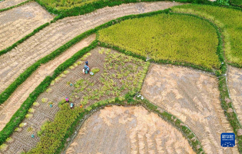 9月17日,農民在貴州省黔東南苗族侗族自治州榕江縣平江鎮平江社區收割稻谷(無(wú)人機照片)。