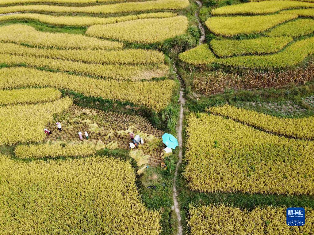 9月17日,在貴州省黔東南苗族侗族自治州施秉縣城關(guān)鎮下翁哨村,村民在收割水稻(無(wú)人機照片)。