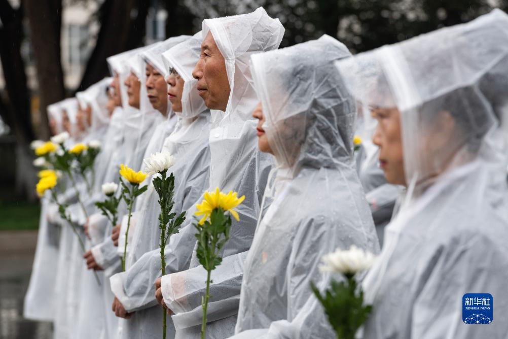9月18日,在哈爾濱市道外區長(cháng)青公園,人們在東北抗日暨愛(ài)國自衛戰爭烈士紀念塔前手持菊花肅立。