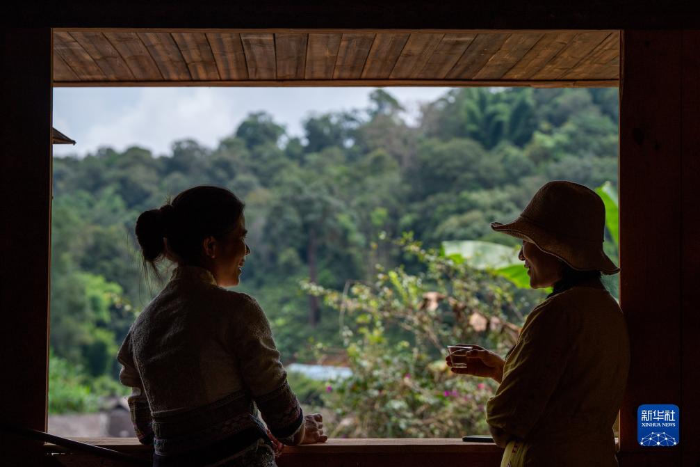 來(lái)自廣東的游客(右)在景邁山糯崗古寨傣族茶農家品嘗普洱茶(9月14日攝)。