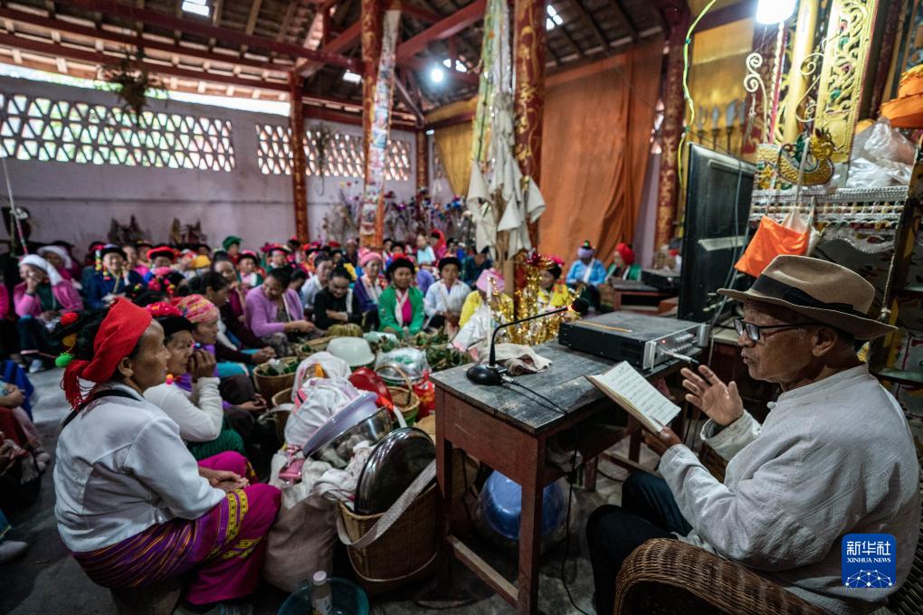 景邁山芒景村文化活動(dòng)室內,年近八旬的布朗族老人蘇國文(右)在給村民介紹生態(tài)和文化保護知識。