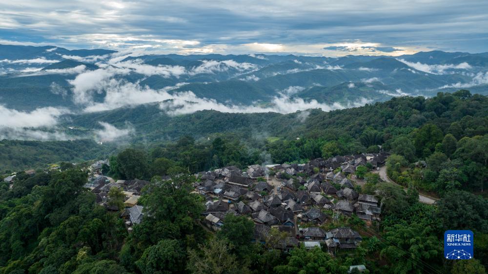 被山林與茶園環(huán)繞的景邁山翁基古寨一景(無(wú)人機照片,9月17日攝)。