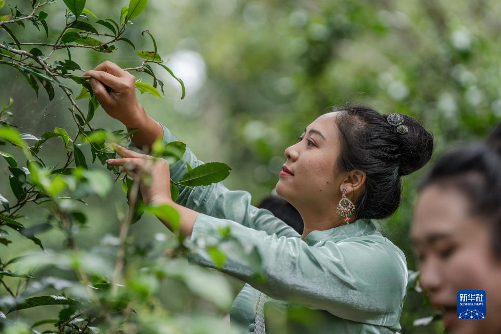 在景邁山大平掌古茶林,傣族姑娘月怕仙在采摘茶葉(9月14日攝)。