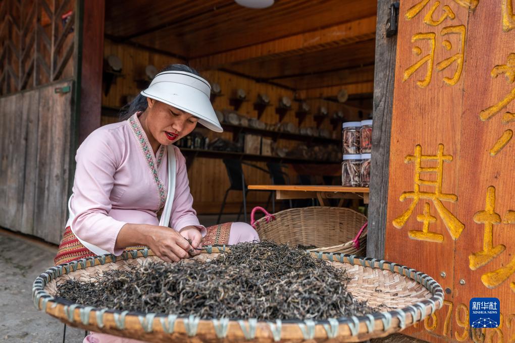 在景邁山翁基古寨,一名布朗族茶農在挑揀茶葉(9月16日攝)。