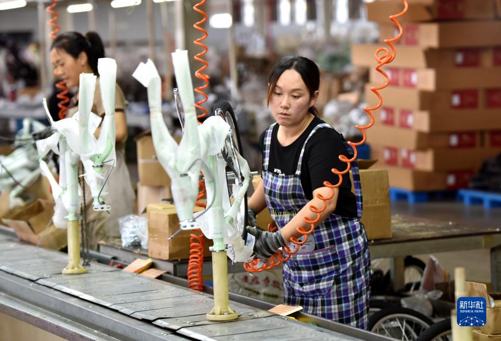 9月18日,河北省威縣一家童車(chē)生產(chǎn)企業(yè)工人在生產(chǎn)車(chē)間組裝童車(chē)。