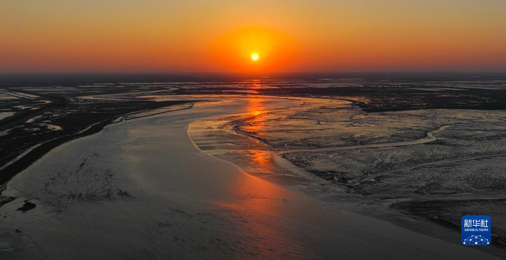 這是鹽城東臺條子泥濕地日落景色(2023年9月1日攝,無(wú)人機照片)。