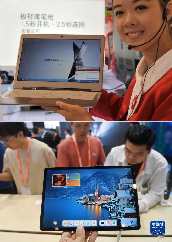 拼版照片:上圖為2011年10月25日,在第8屆中國—東盟博覽會(huì )上,參展商在展示一款筆記本電腦(新華社記者周華攝);下圖為2023年9月18日,在第20屆中國—東盟博覽會(huì )上,人們在了解平板電腦(新華社記者陸波岸攝)。
