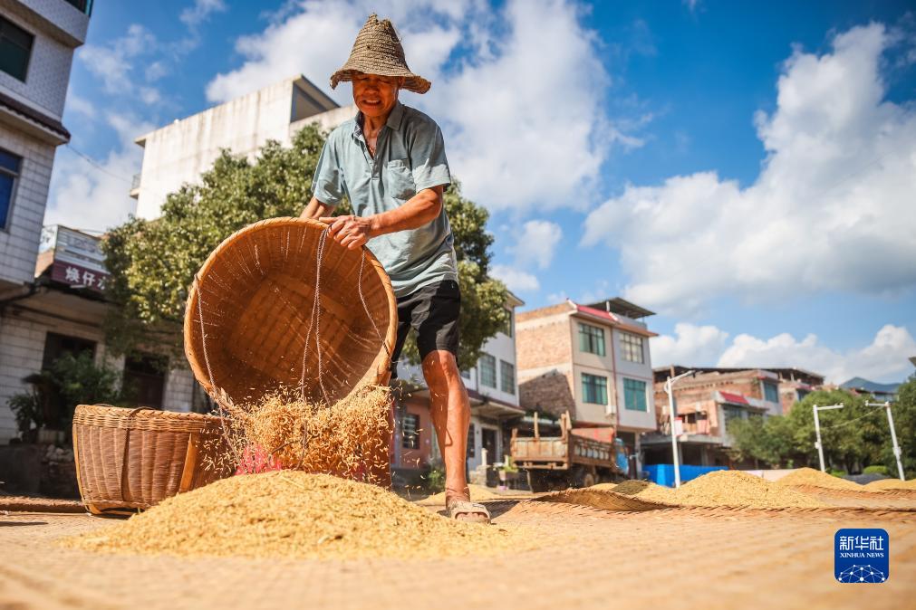 9月18日,在湖南省永州市藍山縣毛俊鎮毛俊村,村民在晾曬收獲的稻谷。