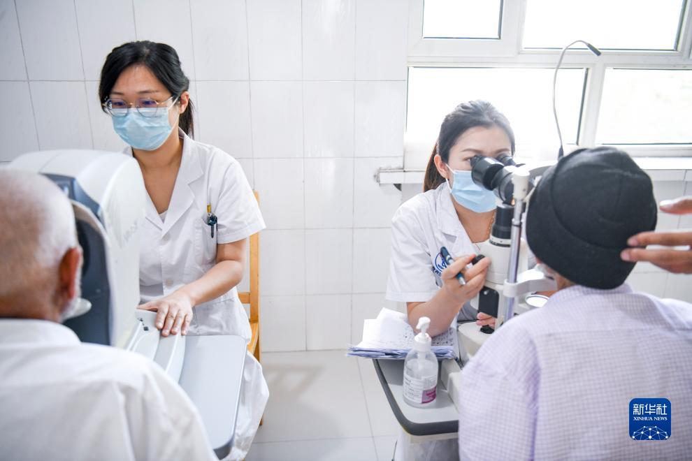 在新疆喀什地區英吉沙縣人民醫院,眼科主任劉媛媛和來(lái)自山東省濟寧市第三人民醫院的援疆醫生石文芳為參加“喀什光明行”接受白內障手術(shù)的患者進(jìn)行檢查(9月15日攝)。9月11日,2023年山東援疆“喀什光明行”活動(dòng)在新疆喀什啟動(dòng),免費救治當地200名符合手術(shù)條件的白內障患者。