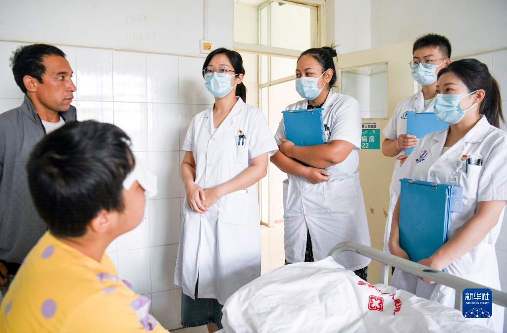 在新疆喀什地區英吉沙縣人民醫院,來(lái)自山東省濟寧市第三人民醫院的援疆醫生石文芳(左三)和當地醫生一起在病房了解參加“喀什光明行”的患者術(shù)后恢復情況(9月15日攝)。9月11日,2023年山東援疆“喀什光明行”活動(dòng)在新疆喀什啟動(dòng),免費救治當地200名符合手術(shù)條件的白內障患者。