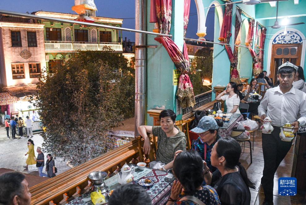 游客在新疆喀什古城百年老茶館內品茶(9月15日攝)。