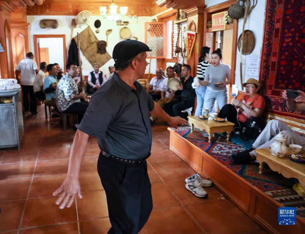 在新疆喀什古城百年老茶館內,人們隨音樂(lè )起舞(9月7日攝)。
