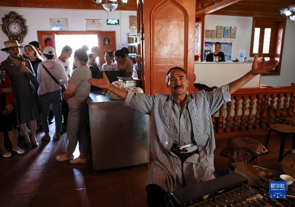 在新疆喀什古城百年老茶館內,樂(lè )手在唱歌(9月7日攝)。