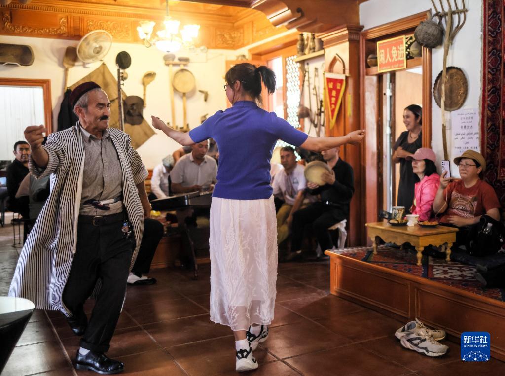 在新疆喀什古城百年老茶館內,人們在隨音樂(lè )起舞(9月7日攝)。