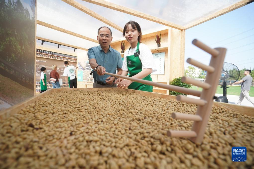 9月19日,在星巴克中國咖啡創(chuàng )新產(chǎn)業(yè)園開(kāi)園儀式現場(chǎng),來(lái)賓在體驗晾曬咖啡生豆。