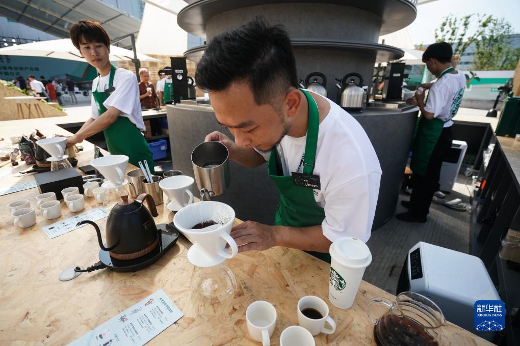 9月19日,在星巴克中國咖啡創(chuàng )新產(chǎn)業(yè)園開(kāi)園儀式現場(chǎng),工作人員制作咖啡。
