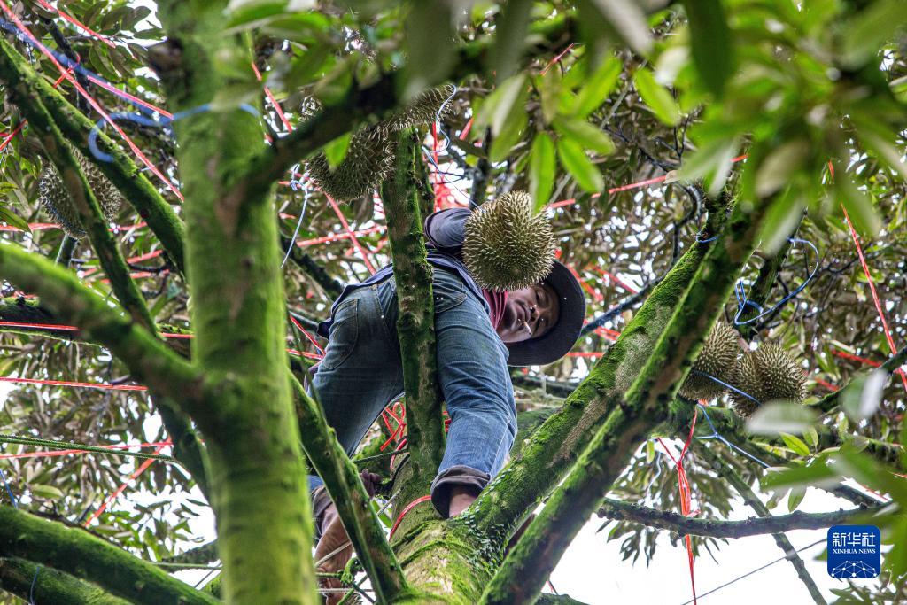 9月18日,在泰國春蓬府一處果園內,工人在樹(shù)上采摘榴蓮。