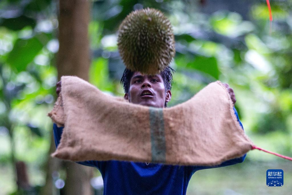 9月18日,在泰國春蓬府一處果園內,工人在樹(shù)下接榴蓮。