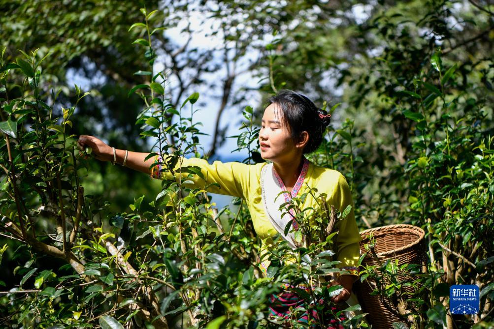 9月19日,景邁山翁基古寨的布朗族茶農玉炳在古茶林里采摘秋茶。