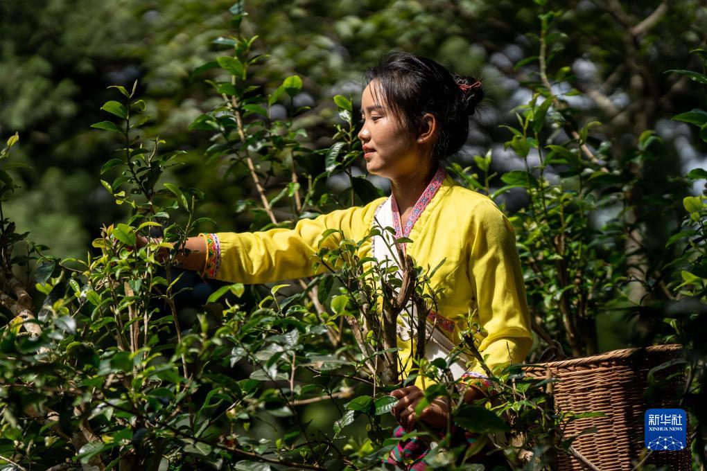 9月19日,景邁山翁基古寨的布朗族茶農玉炳在古茶林里采摘秋茶。