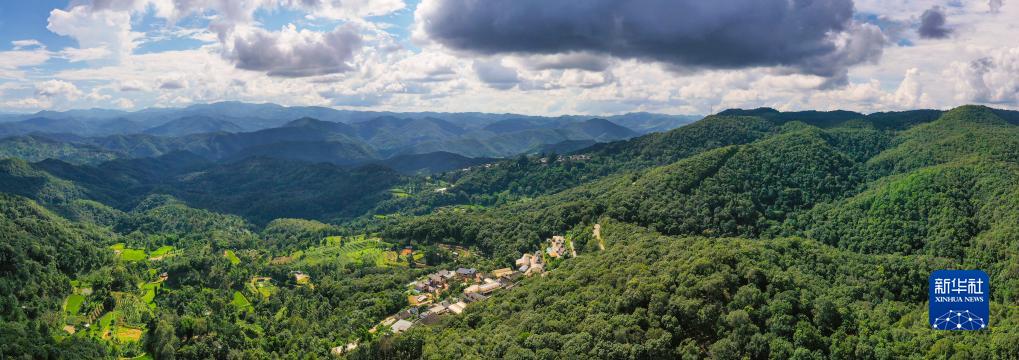 被山林與茶園環(huán)繞的景邁山芒景村一景(無(wú)人機照片,8月30日攝)。