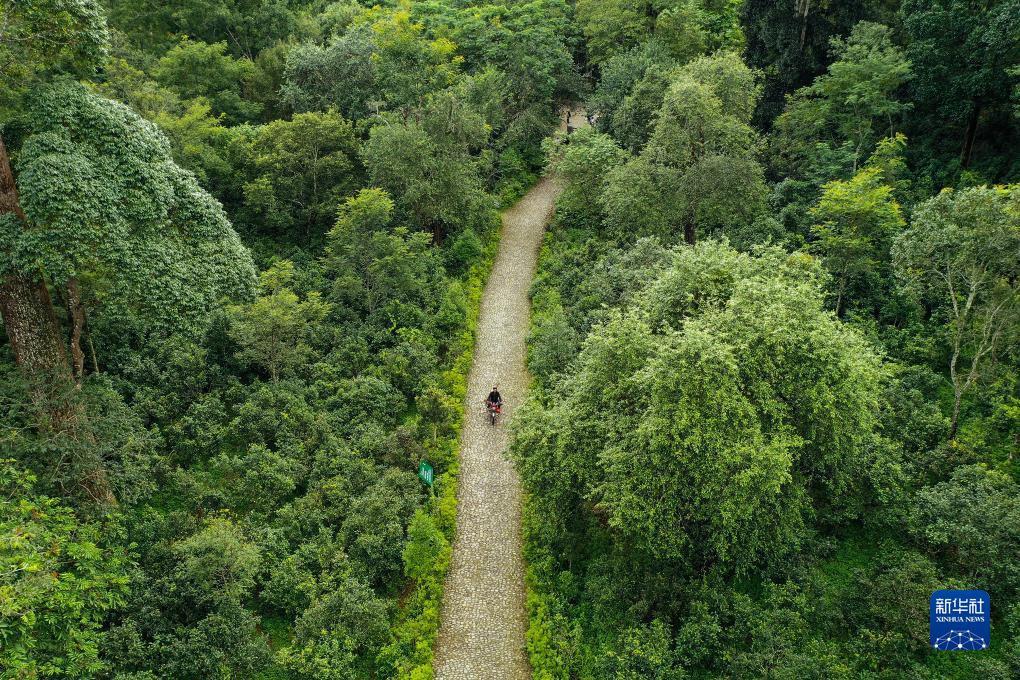 景邁山大平掌古茶林一景。傣族、布朗族等世居民族認識茶樹(shù)生長(cháng)習性,利用自然生態(tài)系統,直接在森林中育茶種茶,使茶林呈現出“喬木層-灌木層-草本層”的立體群落結構,這為茶樹(shù)的生長(cháng)提供了適宜的環(huán)境(無(wú)人機照片,8月29日攝)。