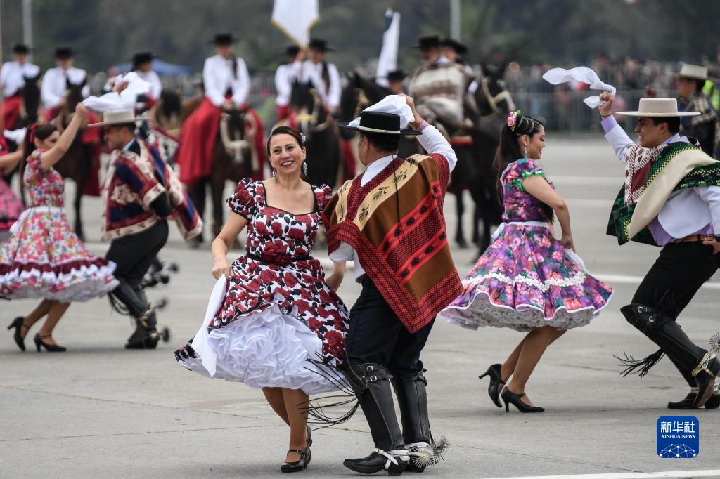 9月19日,在智利首都圣地亞哥,身著(zhù)民族服裝的舞者在閱兵式期間跳起傳統舞蹈奎卡。