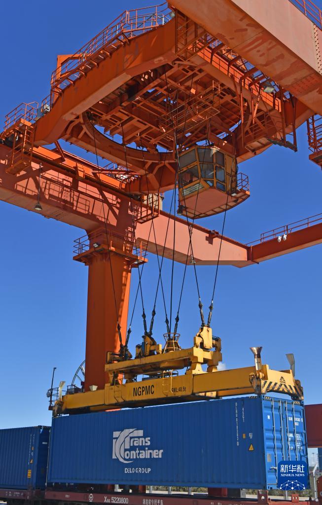 9月19日,在中歐班列(沈陽(yáng))集結中心,中國鐵路沈陽(yáng)局集團有限公司工作人員使用龍門(mén)吊進(jìn)行中歐班列裝車(chē)作業(yè)。