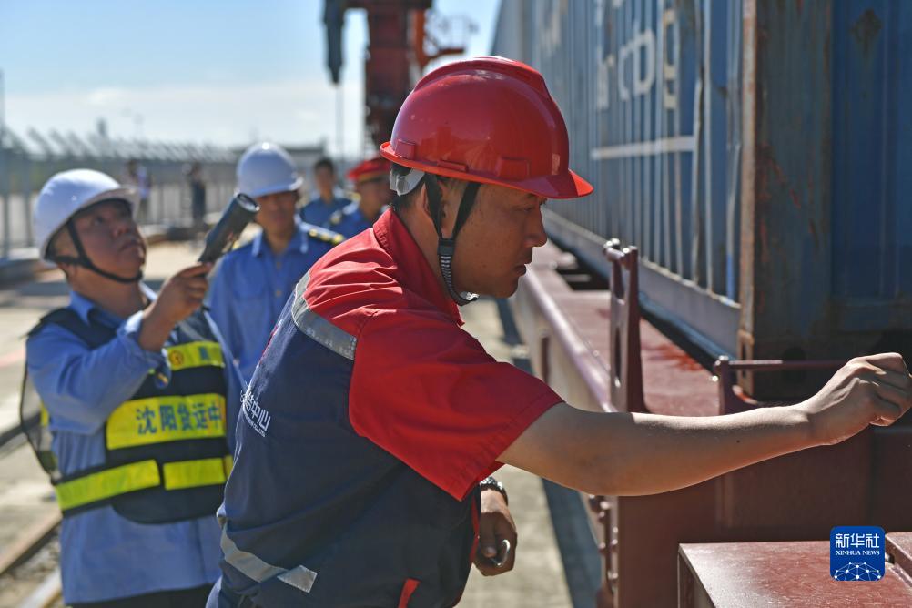 9月19日,在中歐班列(沈陽(yáng))集結中心,中國鐵路沈陽(yáng)局集團有限公司工作人員對集裝箱裝載狀態(tài)進(jìn)行檢查。