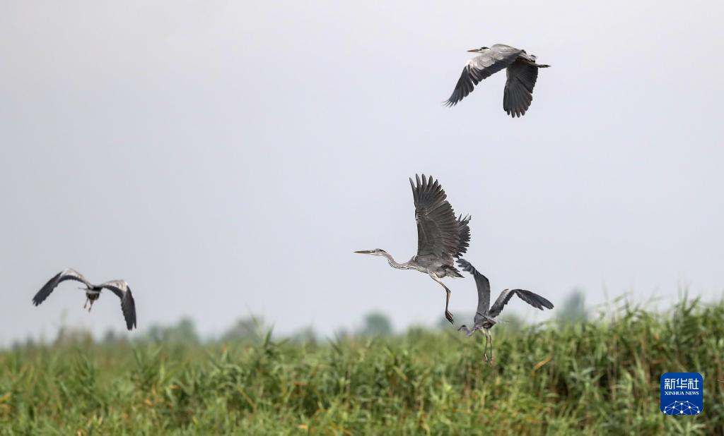 鷺鳥(niǎo)飛行在江蘇鹽城濕地珍禽國家級自然保護區(8月22日攝)。